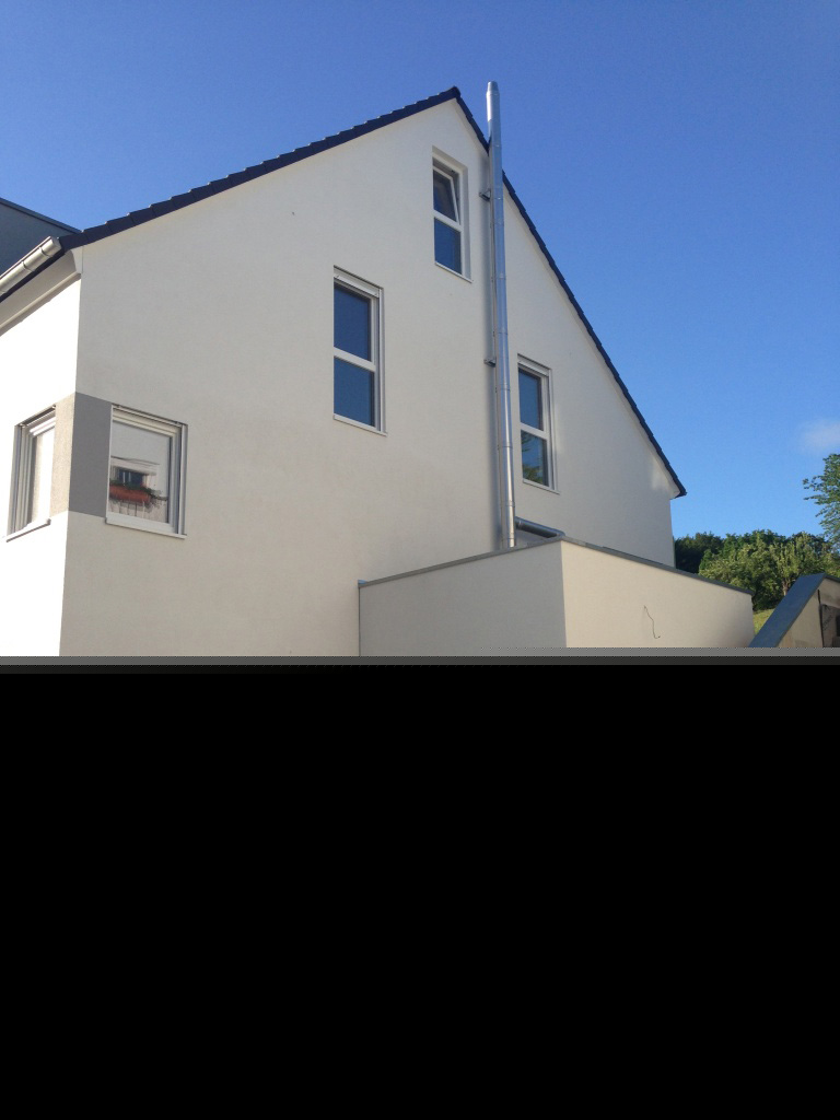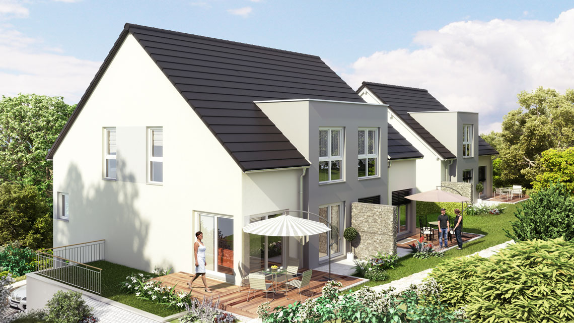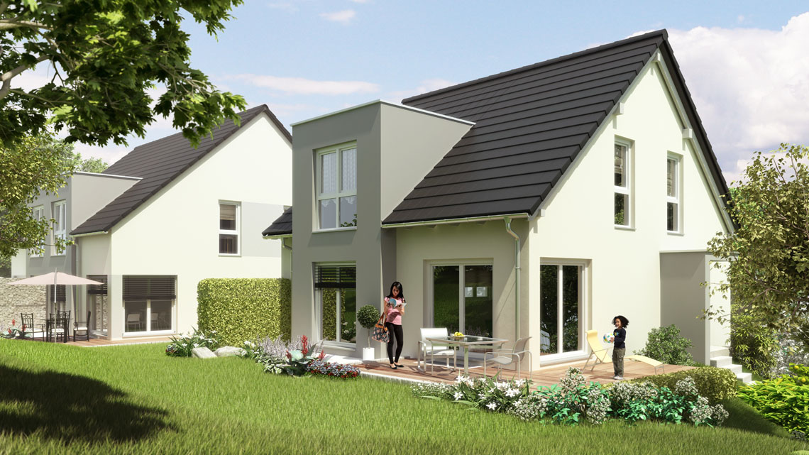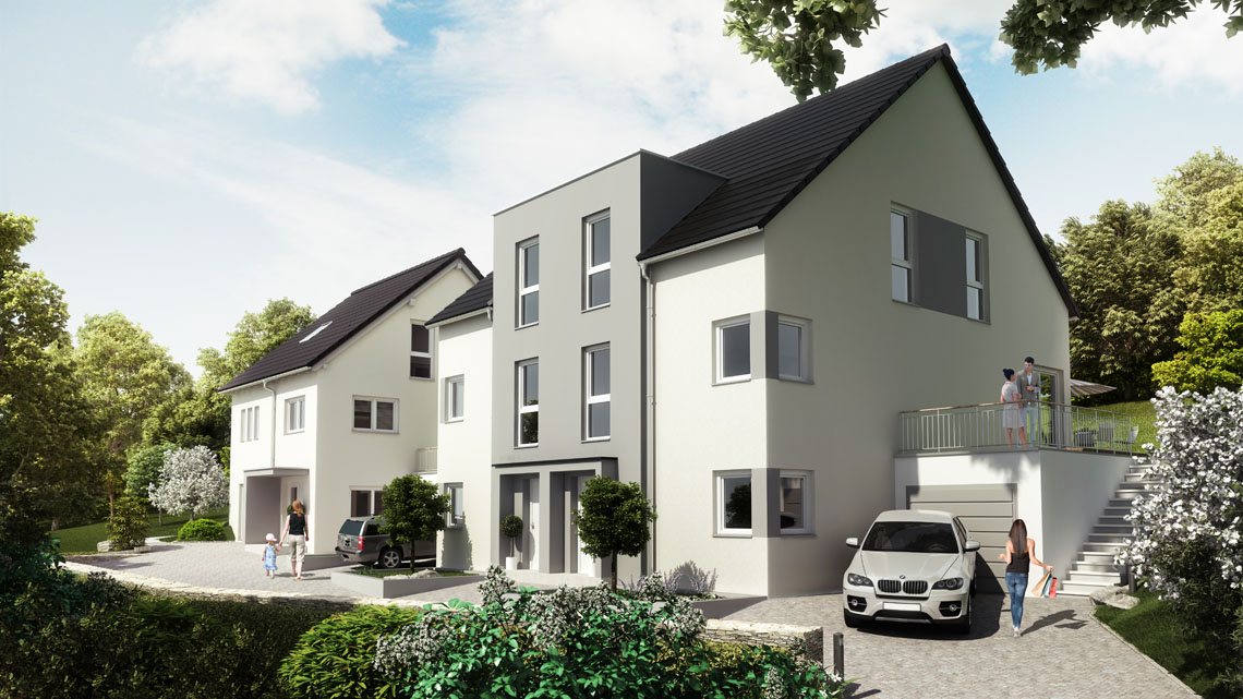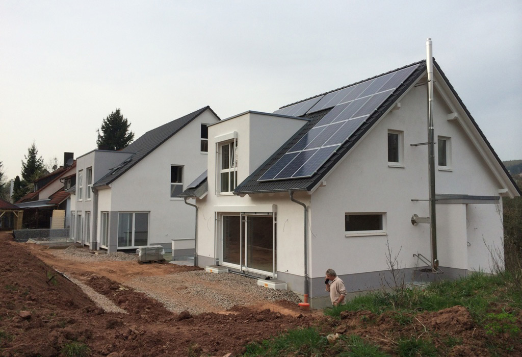 Hier wurde ein Einfamilien- und ein Doppelhaus mit Satteldächern und begrünten Flachdachgaragen, konventionell mit Porenbetonaußenwänden erstellt. Haustechnik mit Pellets- und Fußbodenheizung.